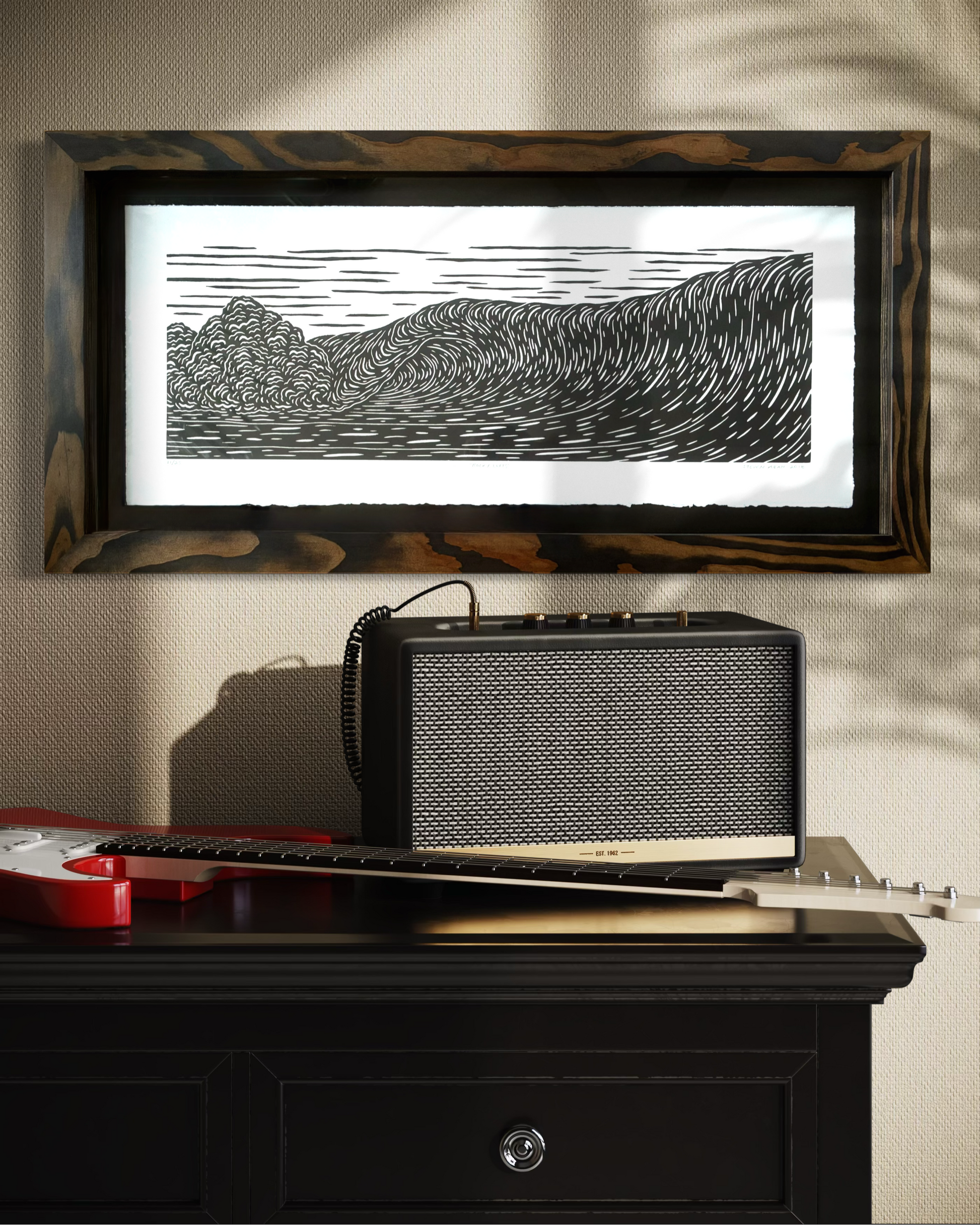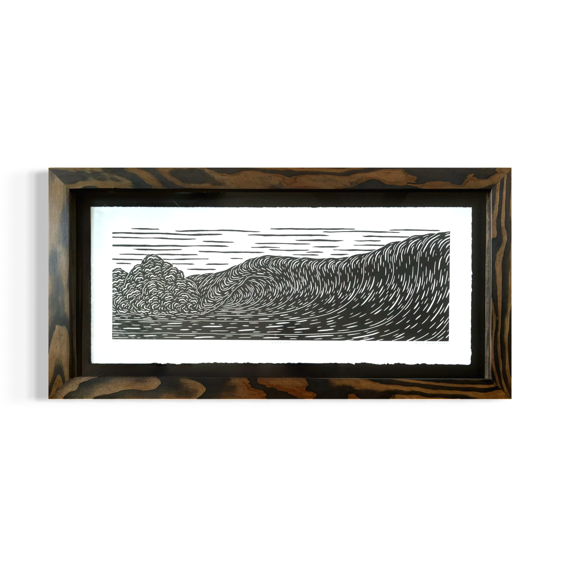 「ロッキー レフト」 – ここでキーンは、オアフ島ノースショアで最も引き裂きやすい波の 1 つであるロッキー レフトを描いています。ロッキー ポイントはスティーブのお気に入りのサーフ ブレイクで、通常は右にサーフィンしますが、時折左にパドルすることもあります。とても楽しい波で、ノースショアで最も安定したスポットの 1 つです。この作品は、木版画の凸版画という手法を用いて制作されました。 BFK Rives Paper に印刷されたオリジナル 25 部の限定版です。この作品は第4位です
