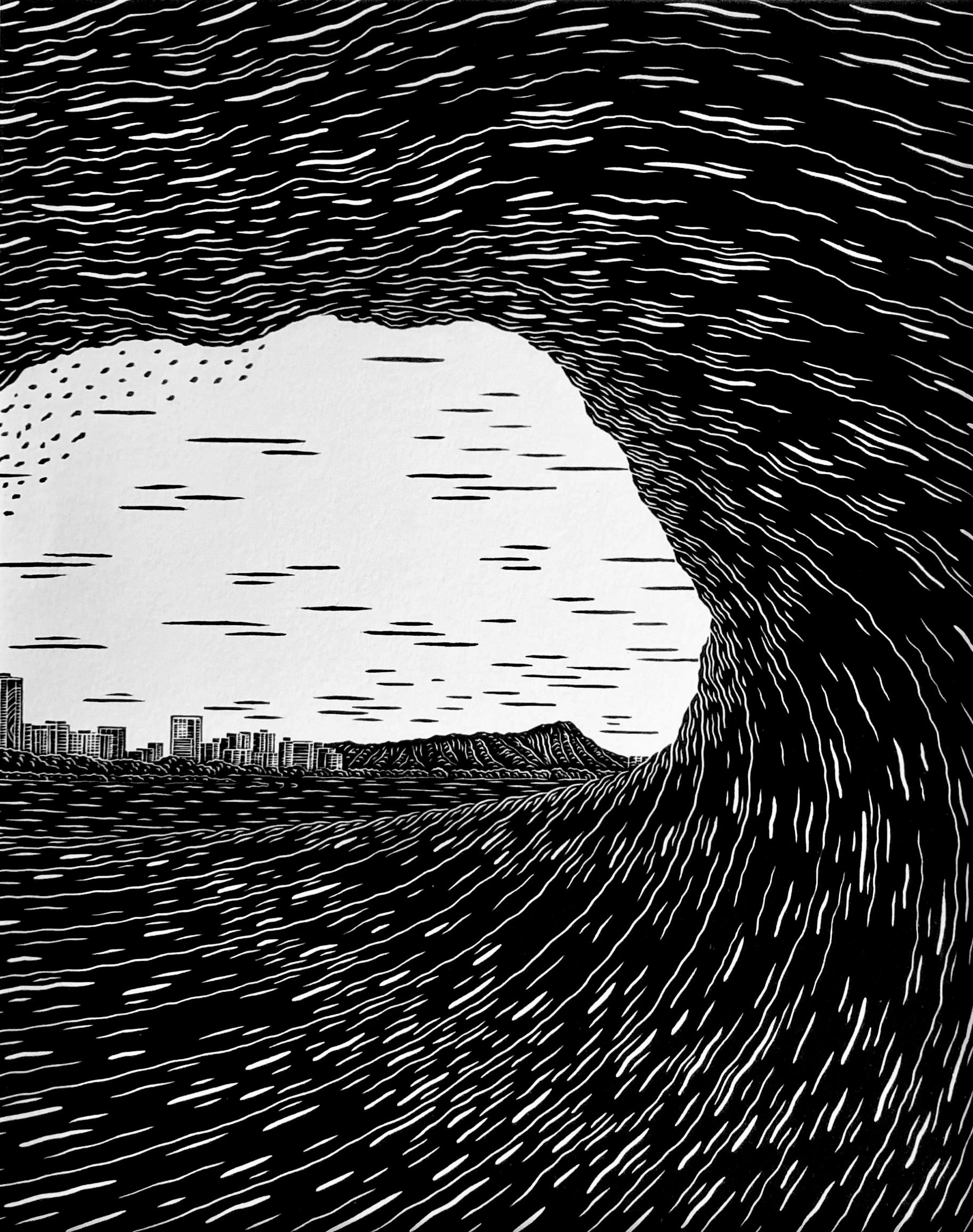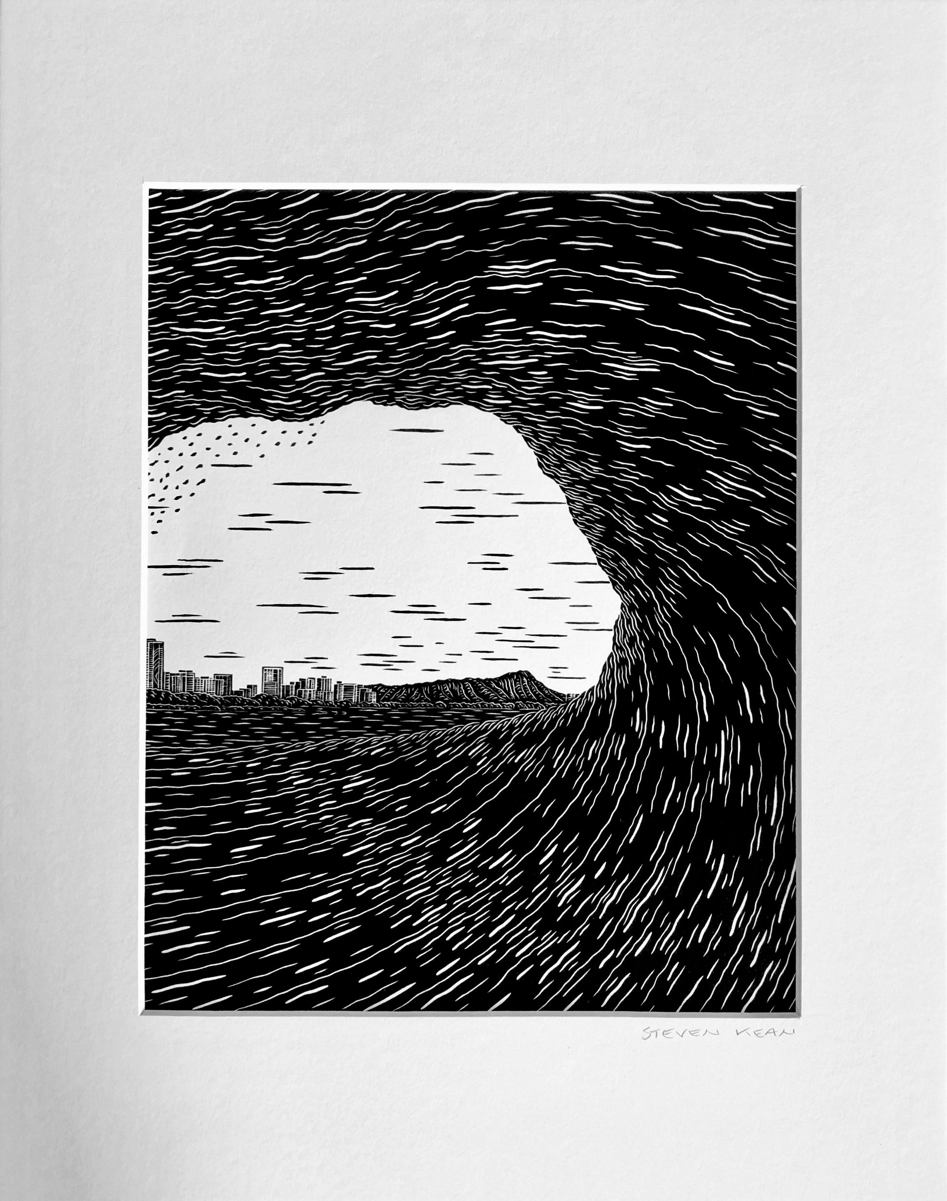 In this piece Kean ponders the relationship between human, land and sea. The viewer is treated to a vantage point from inside the barrel of a breaking wave on the South Shore of Oahu. The reference photo for the original work, a woodcut print, was inspired by a photo captured by North Shore surfer, friend and WSL Fantasy Surfer opponent Joey Sadoy.