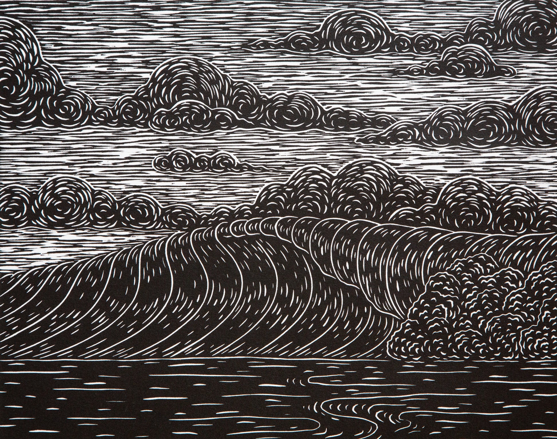 In this piece, Kean pays homage to his most favorite surf break on the North shore of Oahu, Rocky Point. He’s been drawn to the wave since moving to the North Shore in 2007. While carving the woodblock he focused on contrasting textures in the sky and sea as well as crisp line work while depicting the fast breaking wave.