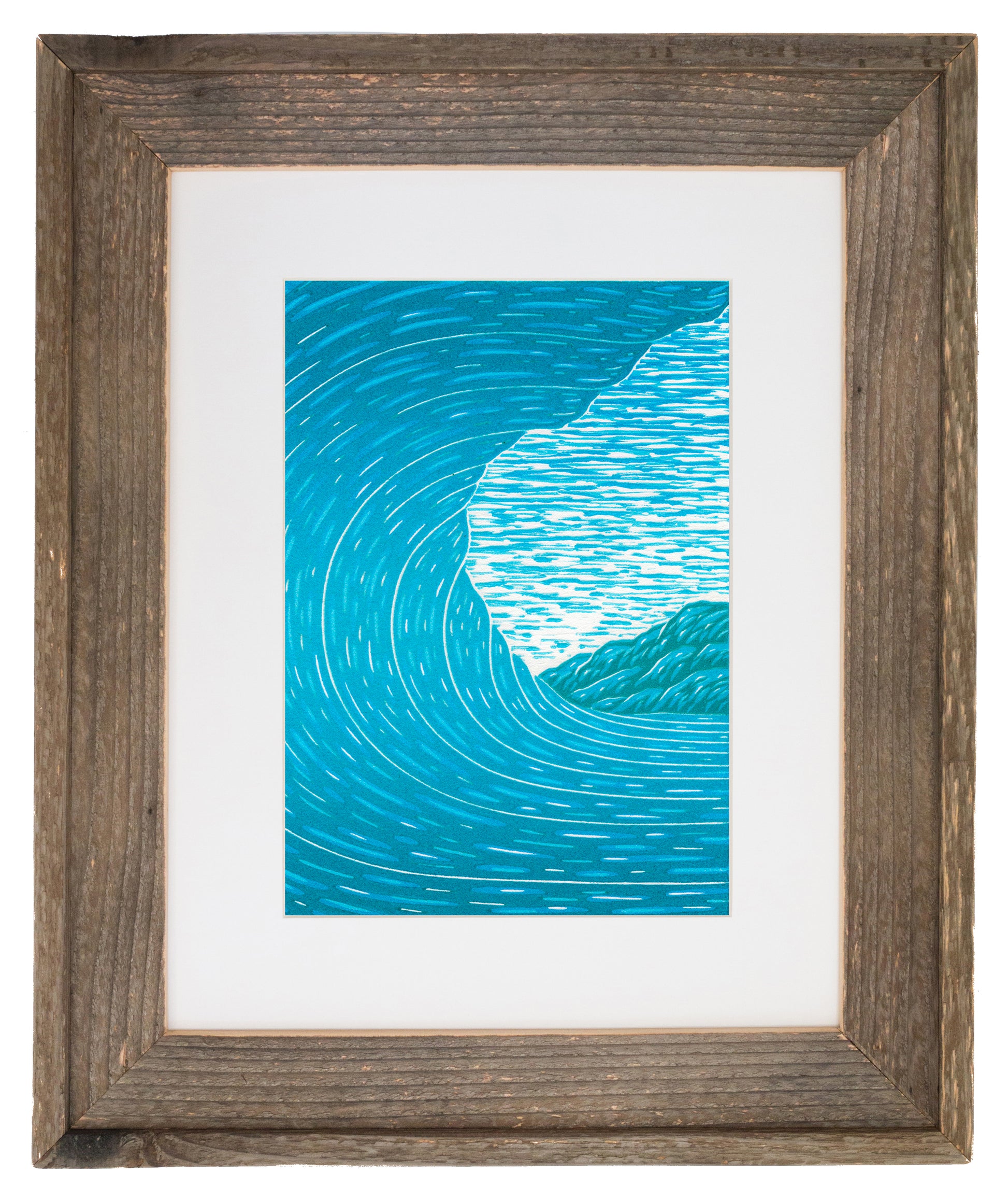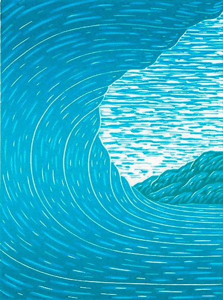 A four layer color reduction woodblock print, 'Aqua' is one of the first prints created on Kean's recently acquired home studio press. It's the first attempt in over 15 years venturing in this style of printmaking. Color Reduction is a process where the artist carves into a block of wood, rolls ink onto it and prints it onto paper. A 2nd, 3rd and 4th layer were carved and printed to achieve the imagery depicted here. Kean also created a gradient of color with each layer of ink to create a subtle highlight in the central portion of the wave. The viewer is drawn from the foreground (wave) to the background (land/island) by this slight change in hue. The textures throughout the image are contrasting yet cohesive in nature and appearance. Kean hopes to elicit tranquil and calm feelings through the use of a variety of blue hues.