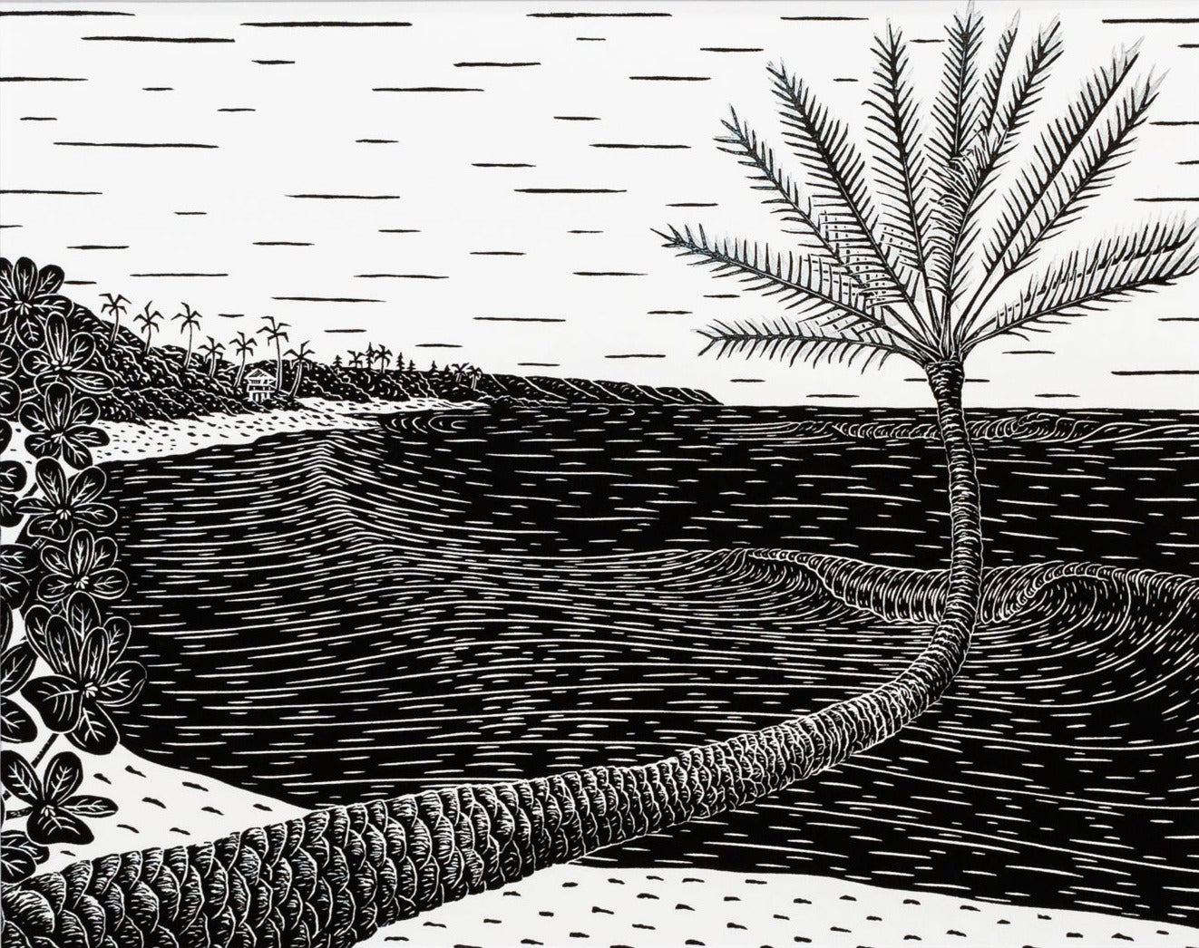 The Palm Tree at Sunset Beach is said to be over 100 years old. It also happens to be one of the most photographed Palms on the planet. Kean stepped out of his comfort zone in this piece; adding to the technicality of the work is a second block that was carved, printed with gray ink on top of the existing layer of black ink.