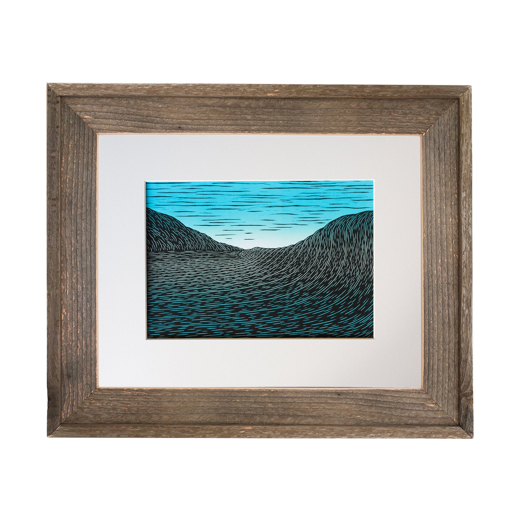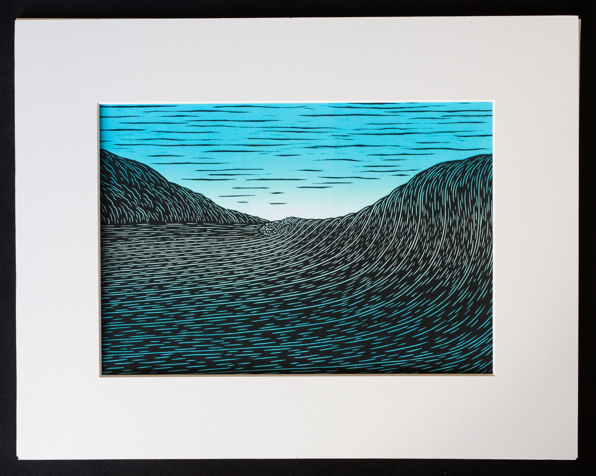 'Cliff's' is Kean's take on this South Shore of Oahu surf break. In the summer months, with a good south swell, Cliff's is the spot to be. The original work of art was created using the woodcut method of relief printmaking with an added color blend monoprint.