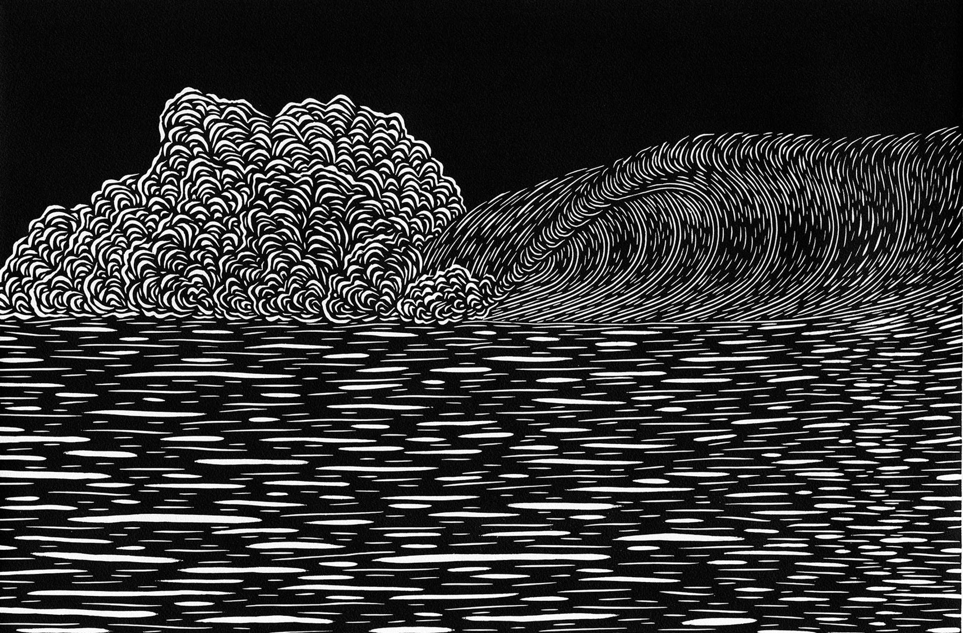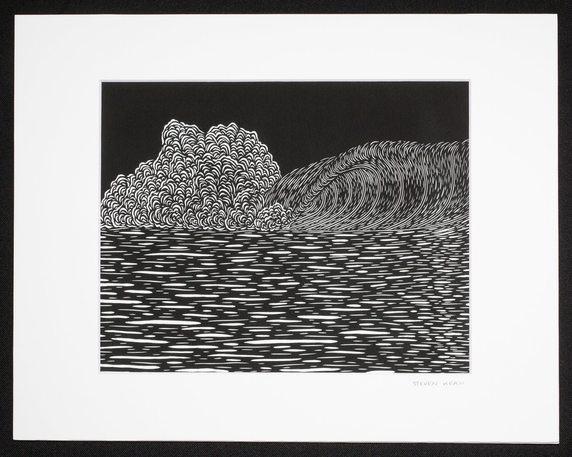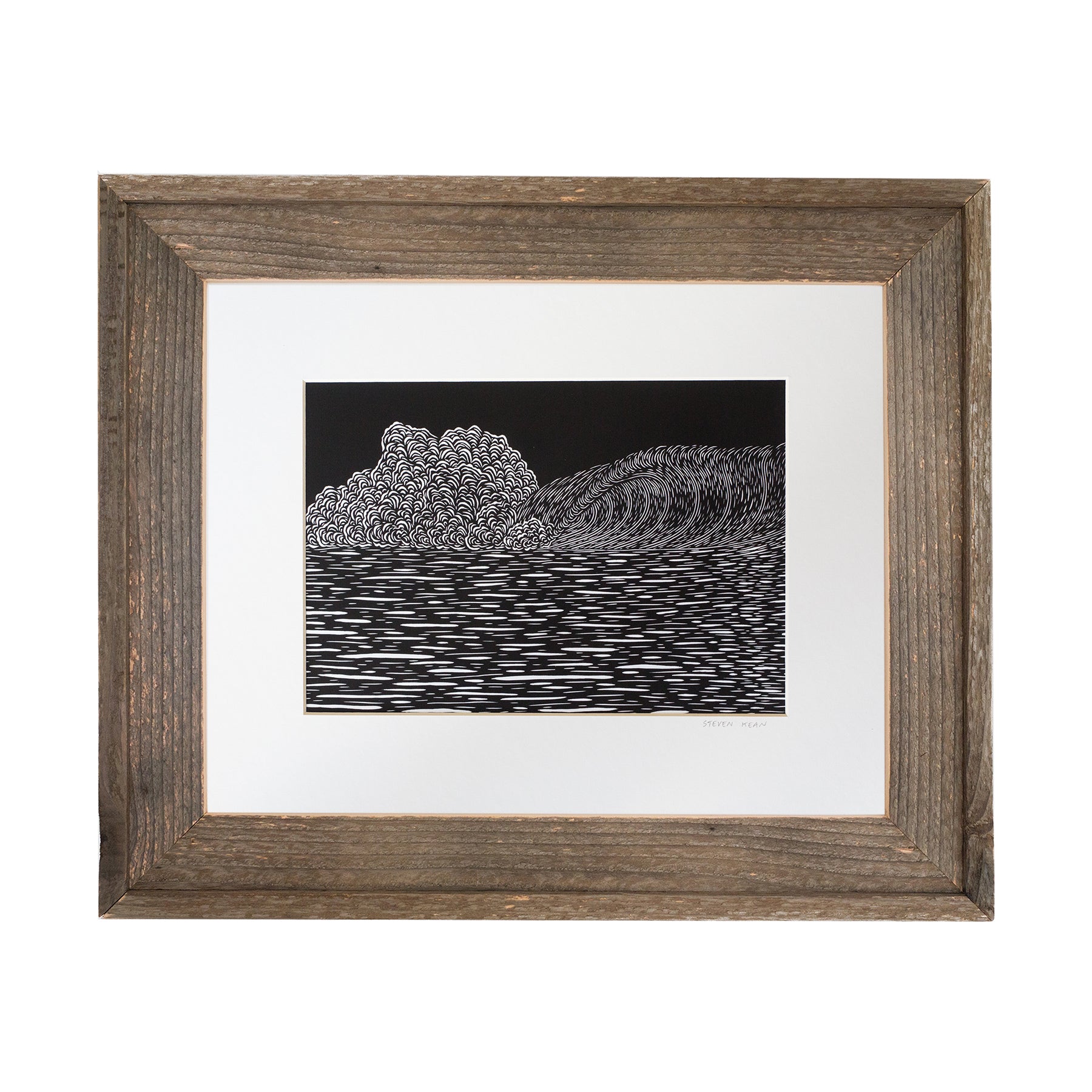 In this image, Kean incorporates a variety of carefully carved lines to depict contrast in the smooth surface of the wave and the breaking white water. The original woodcut print measures 22”x30”.
