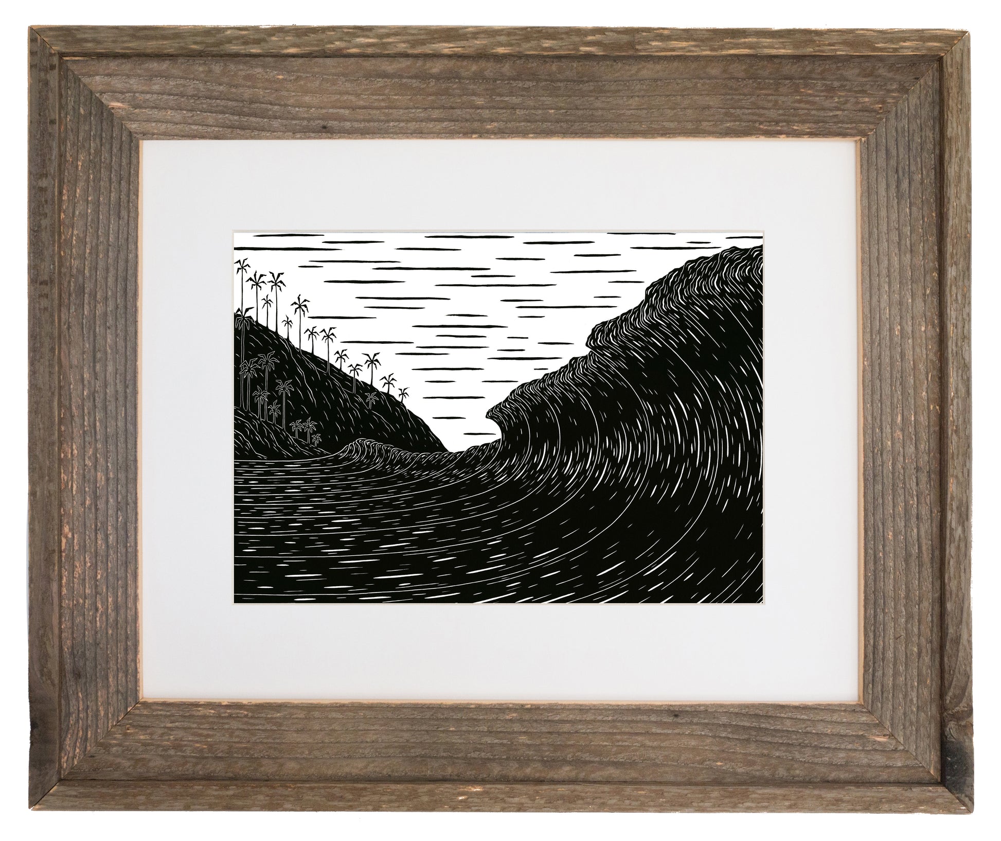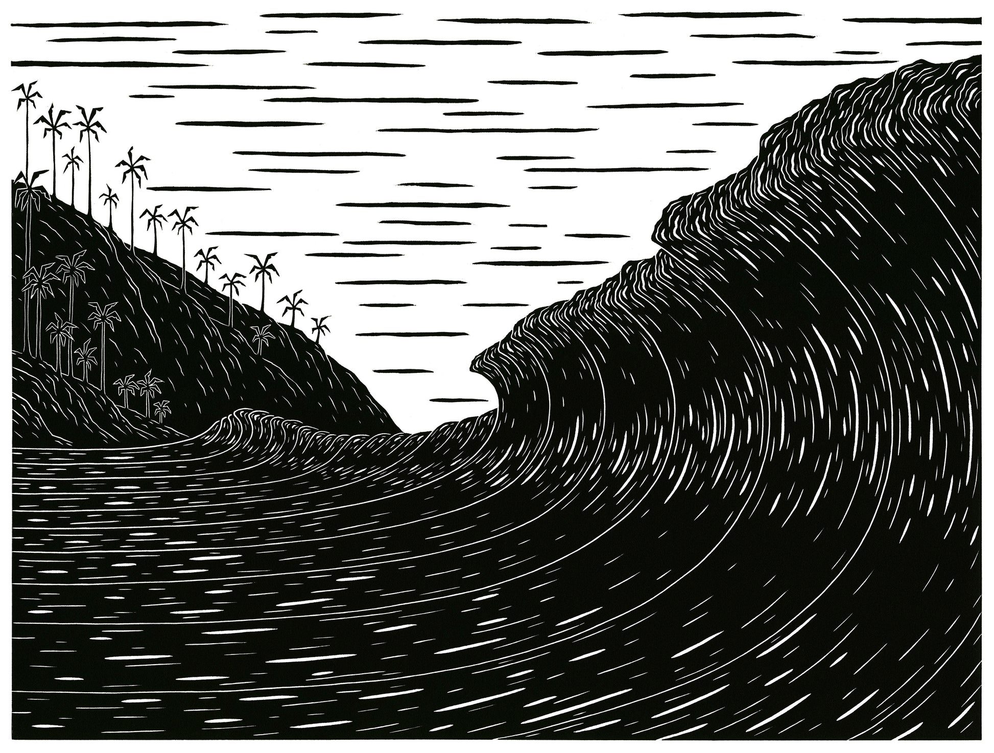 The ocean heals. It’s also the place where I feel the most free and in my element, away from the chatter that sometimes fills my mind. In this piece, I hope to elicit these emotions from the viewer, providing an escape of sorts; conveying island vibes through the usage of carefully carved lines in a classic black and white format.