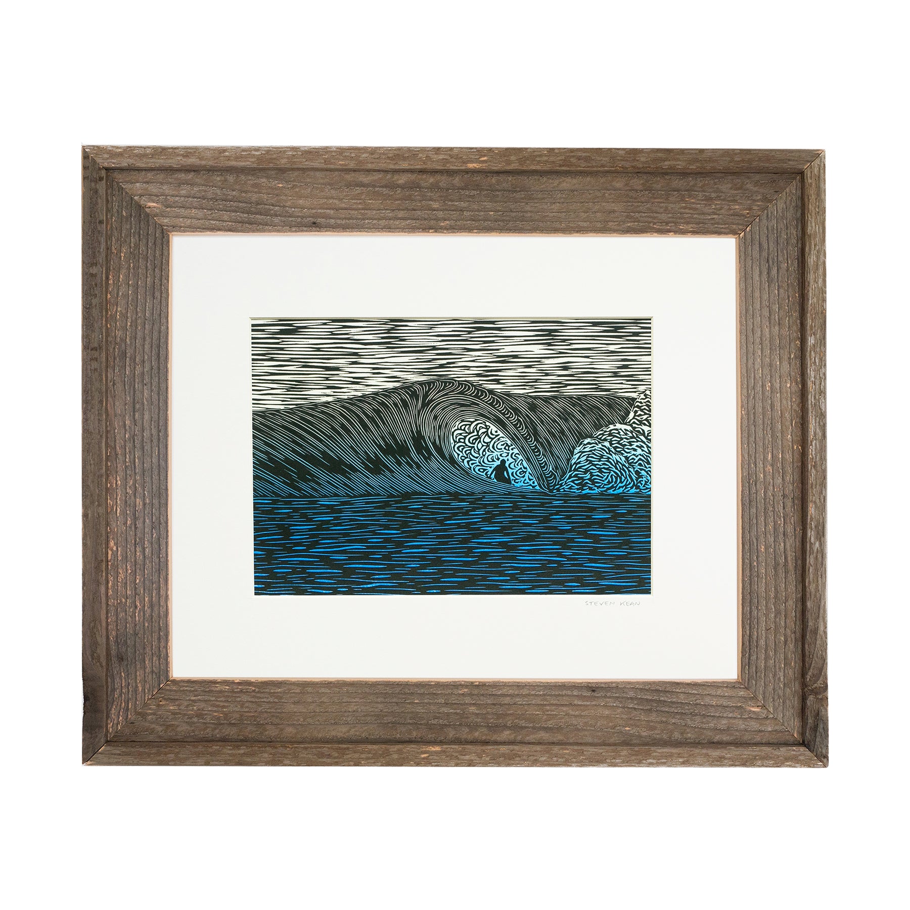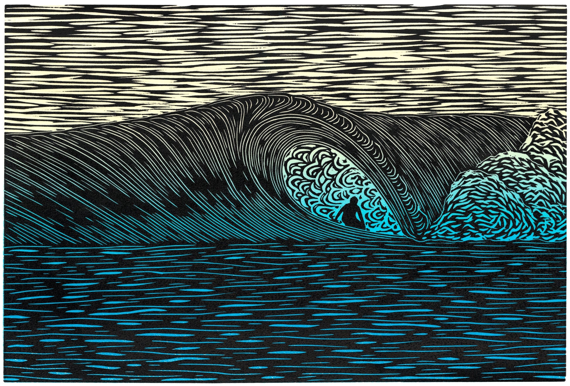 One of Kean's most popular images, the original 'Ghost in the Machine' measures 22"x30" and was created using the woodcut method of relief printmaking with an added color blend monoprint.