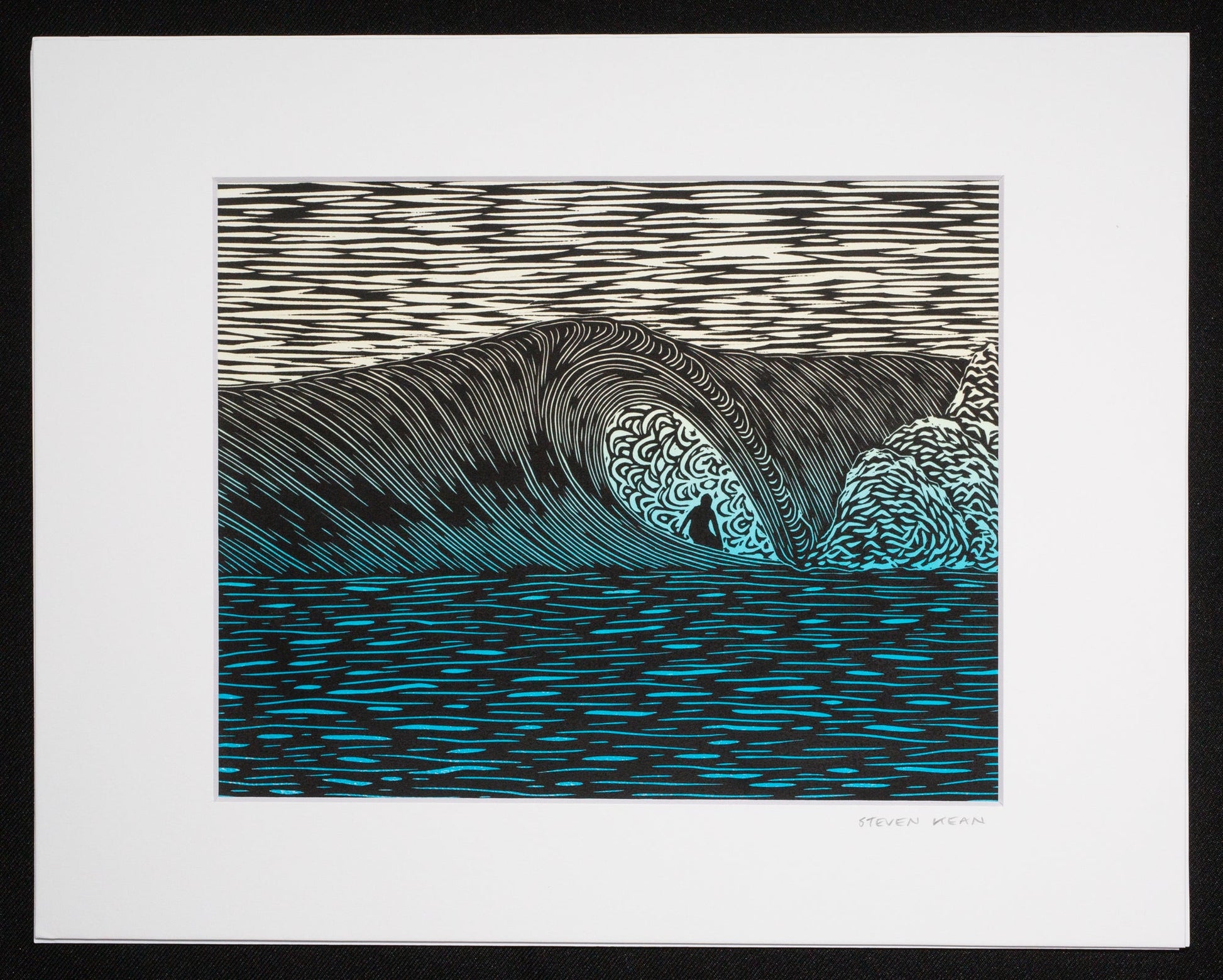 One of Kean's most popular images, the original 'Ghost in the Machine' measures 22"x30" and was created using the woodcut method of relief printmaking with an added color blend monoprint.