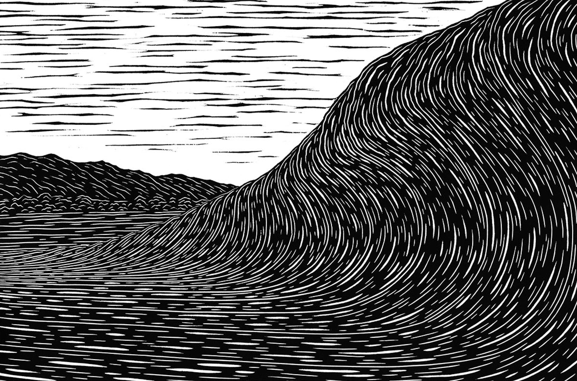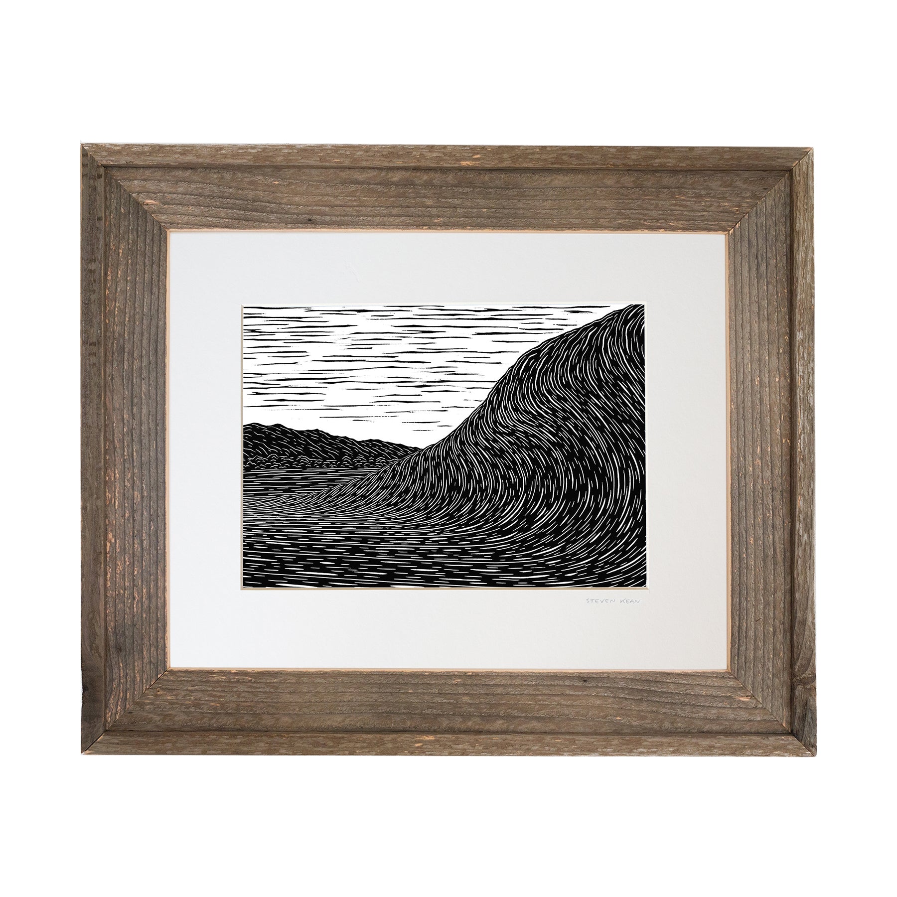 Keiki Beach on the North Shore of Oahu is known for its powerful shore break. In this woodcut print, Kean illustrates a wave standing straight up ready to explode onto the sand. A common site in the winter months, this wave is best viewed from the safety of the beach.