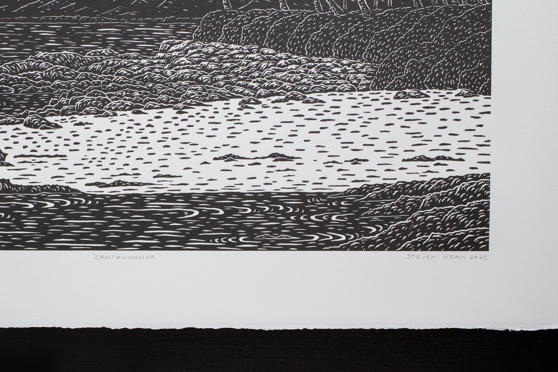 In this very limited edition original woodblock print of only 10, Kean depicts a coastal scene within Ko Olina, Oahu called ‘Lanikūhonua.’ In the Hawaiian language, it translates to ‘Where Heaven Meets the Earth’ and is a name given by Kamokila Campbell describing this breathtaking view.