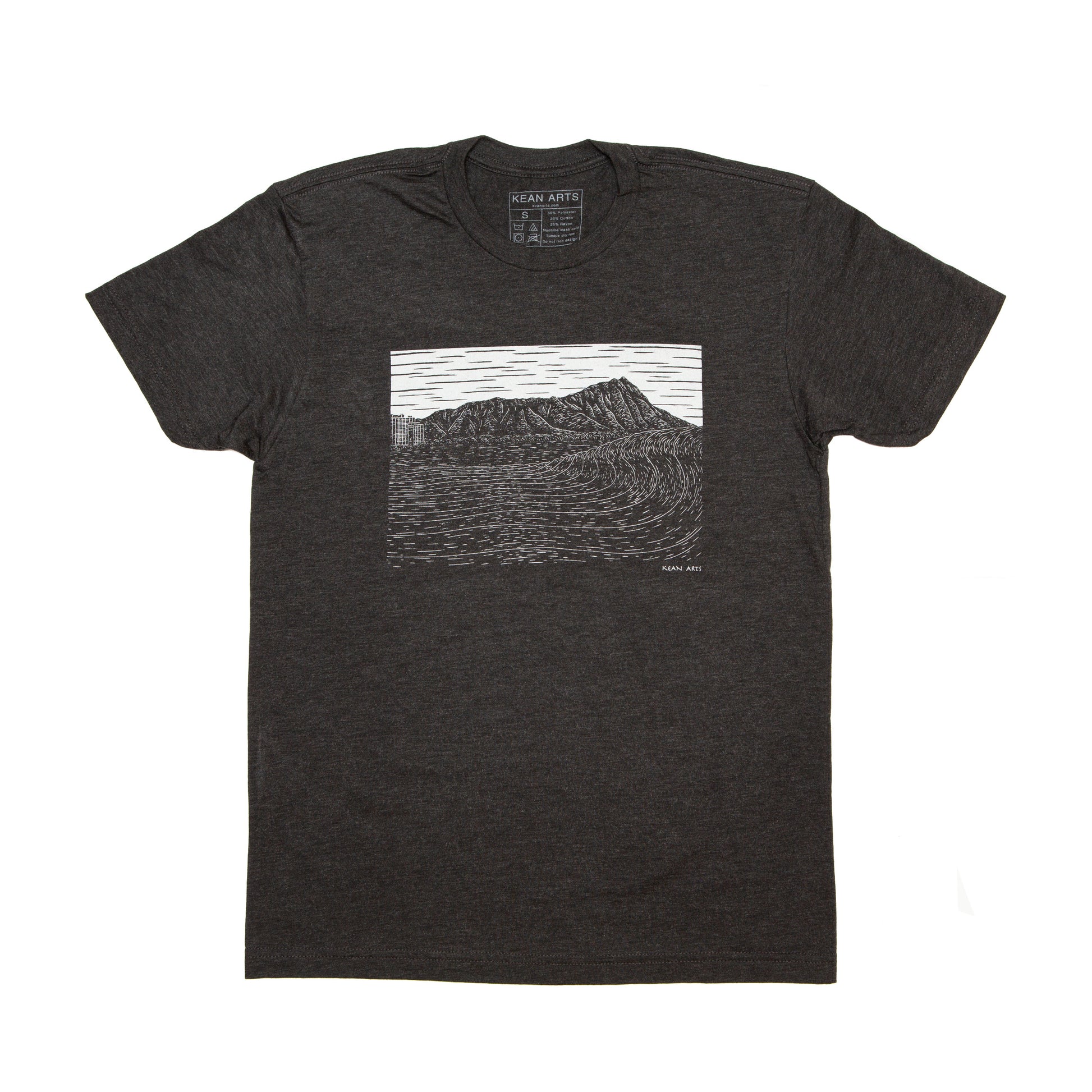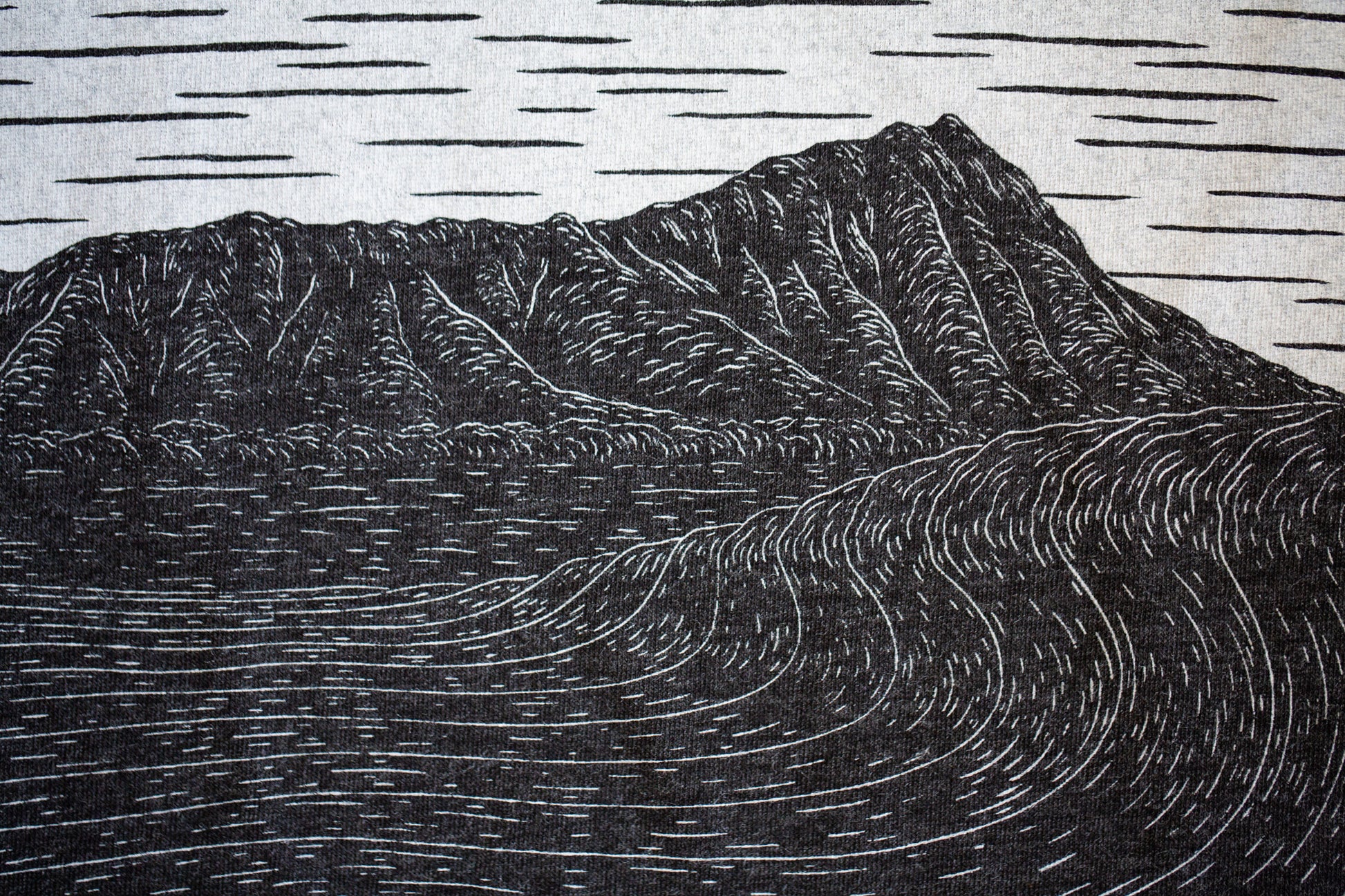 The most recognizable landmark in Hawaii, Le’ahi (Diamond Head) is believed to have been formed 300,000 years ago. It is said that Hi’iaka, sister of the goddess Pele, gave Le’ahi its name because the summit resembles the forehead of the ‘ahi fish. Kean captures the iconic vista here in the form of a woodcut print.