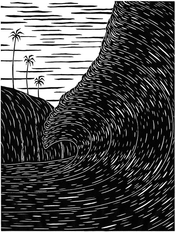On the northwest of Kauai, you’ll find one of natures most epic creations - the Na Pali Coast. In the Hawaiian language, Na Pali literally translates to ‘many cliffs.’ In this woodcut print, Kean offers a view of the Na Pali as seen from the pocket of a breaking wave.