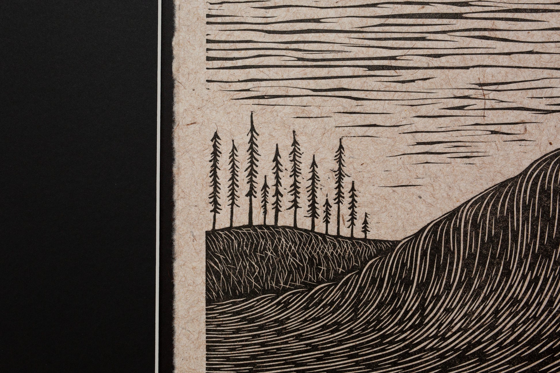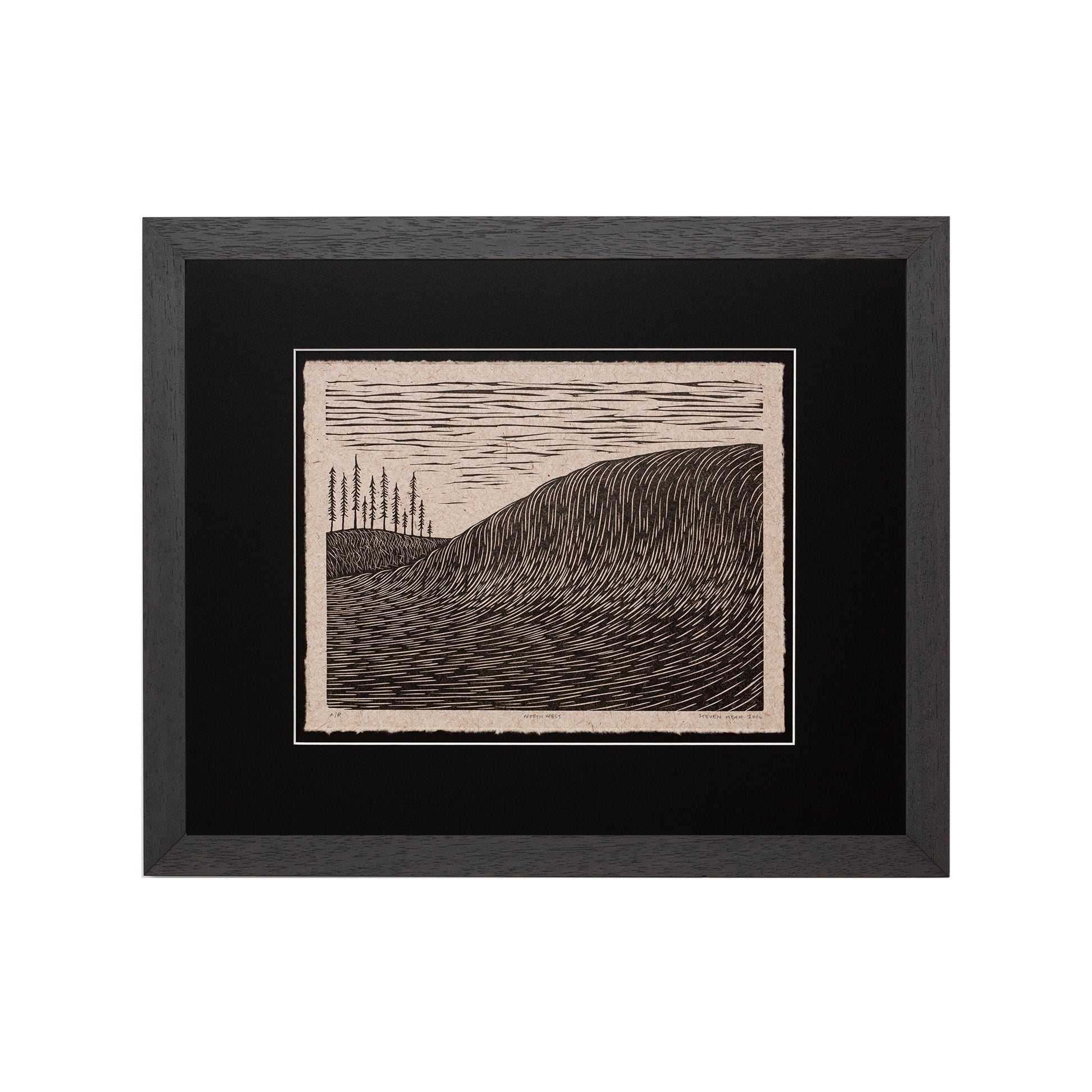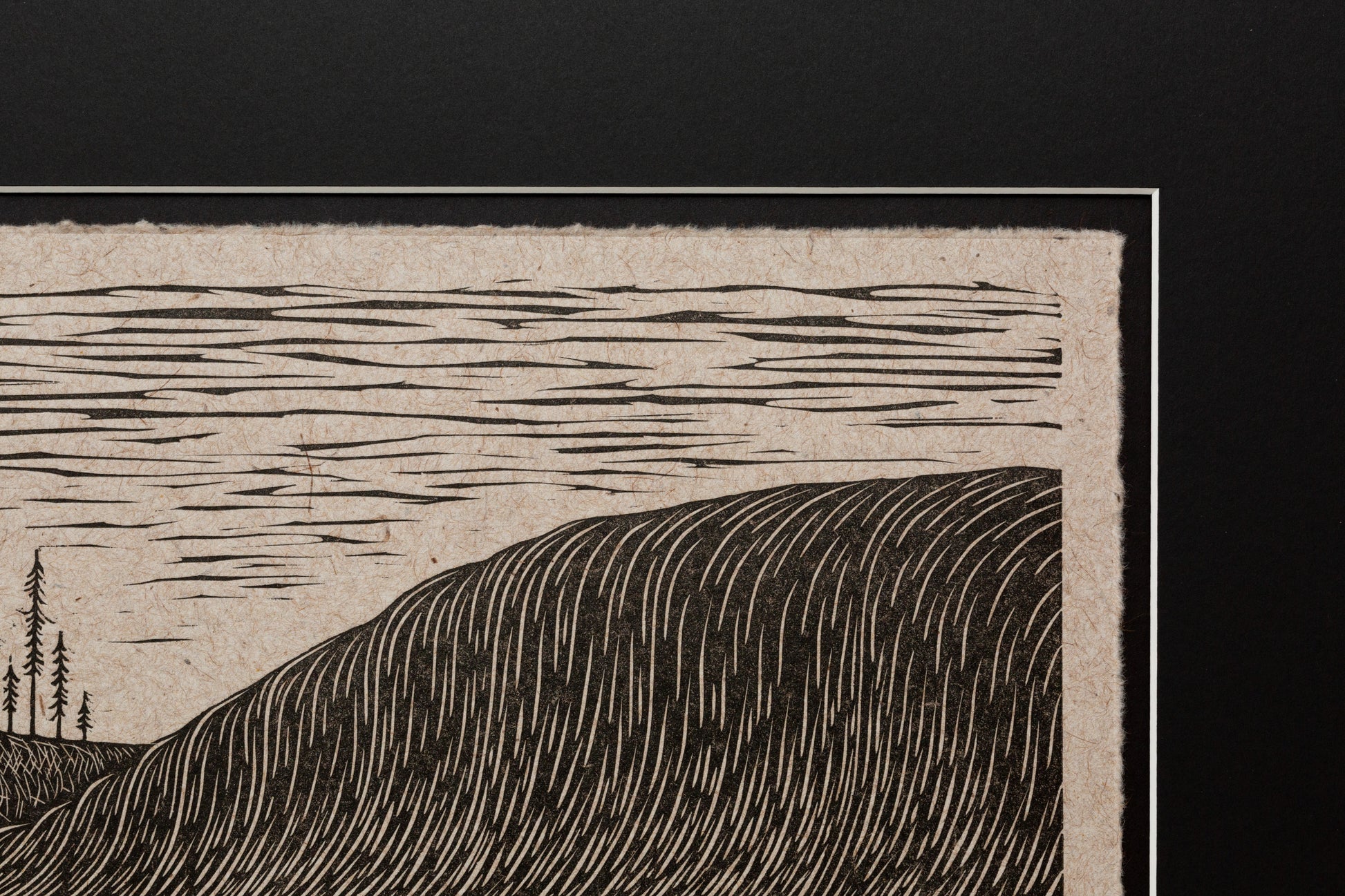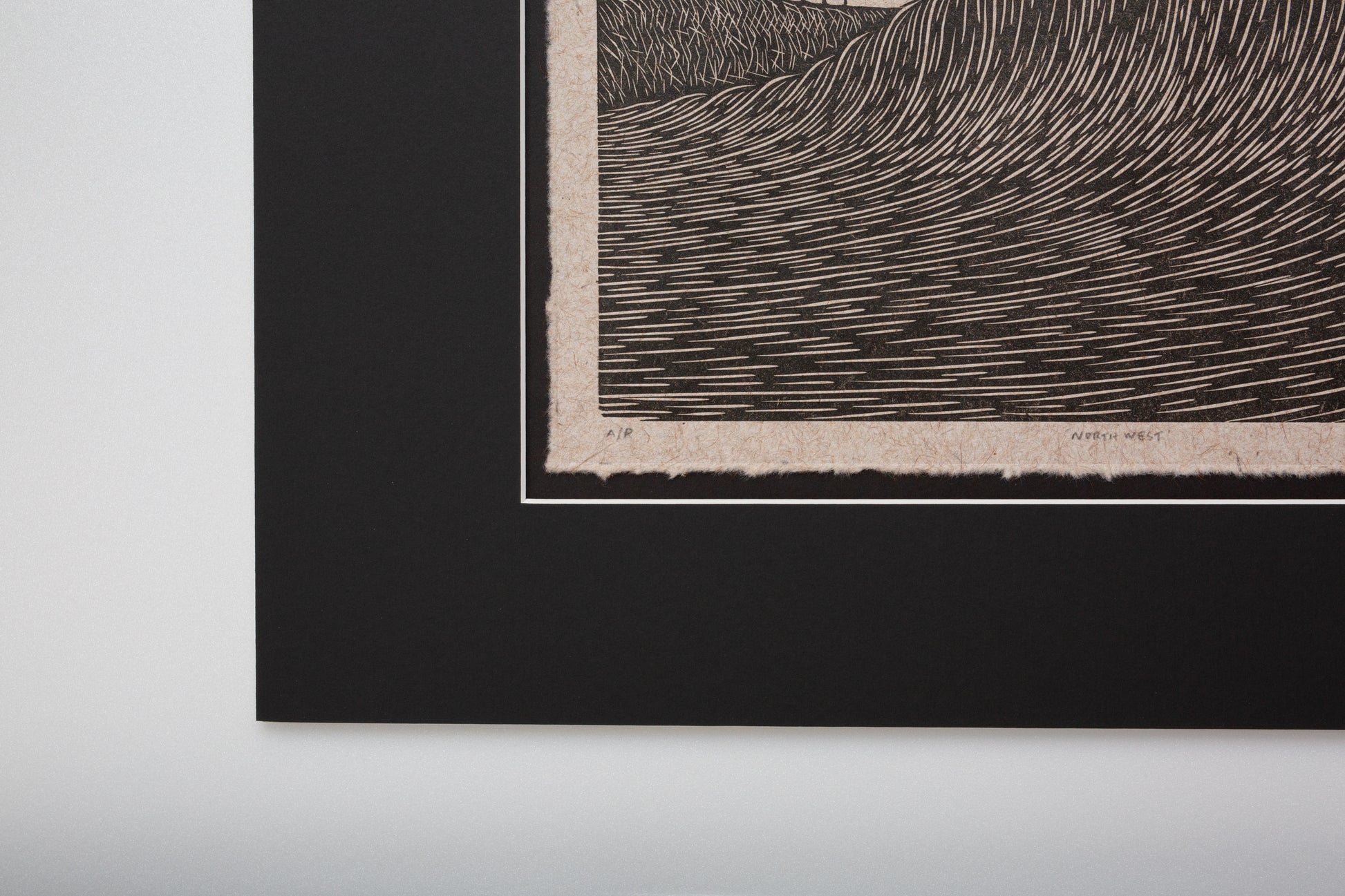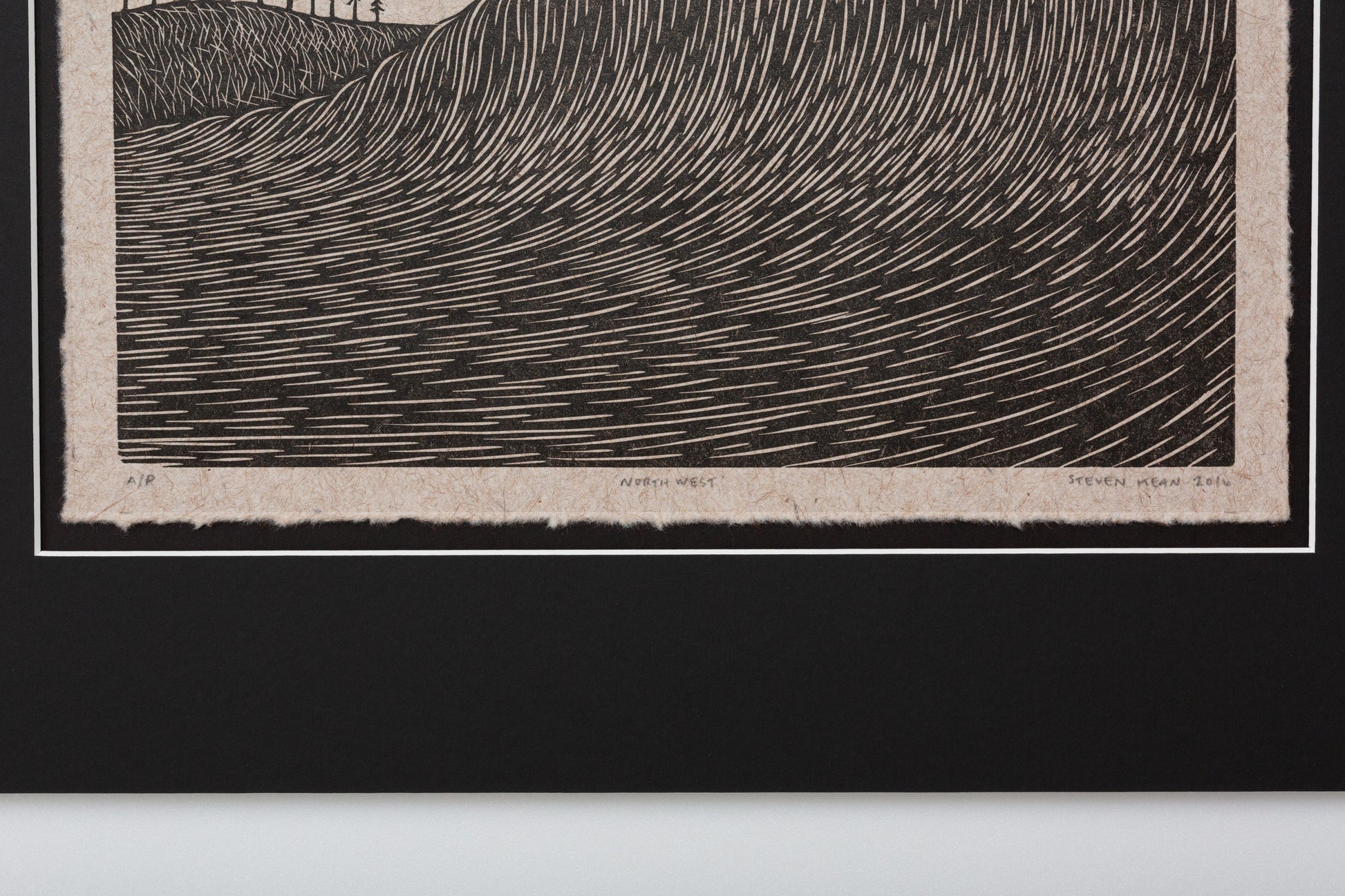 This piece was inspired by a trip taken to the Pacific Northwest. Kean was drawn to the raw and rugged coastline and couldn't resist a surf in the cold waters. A local surfer provided some knowledge of a surf break nearby. Soon after Kean was on his rented board, in a rented wetsuit and booties and in the lineup. Stoked and inspired, he created this linocut print.