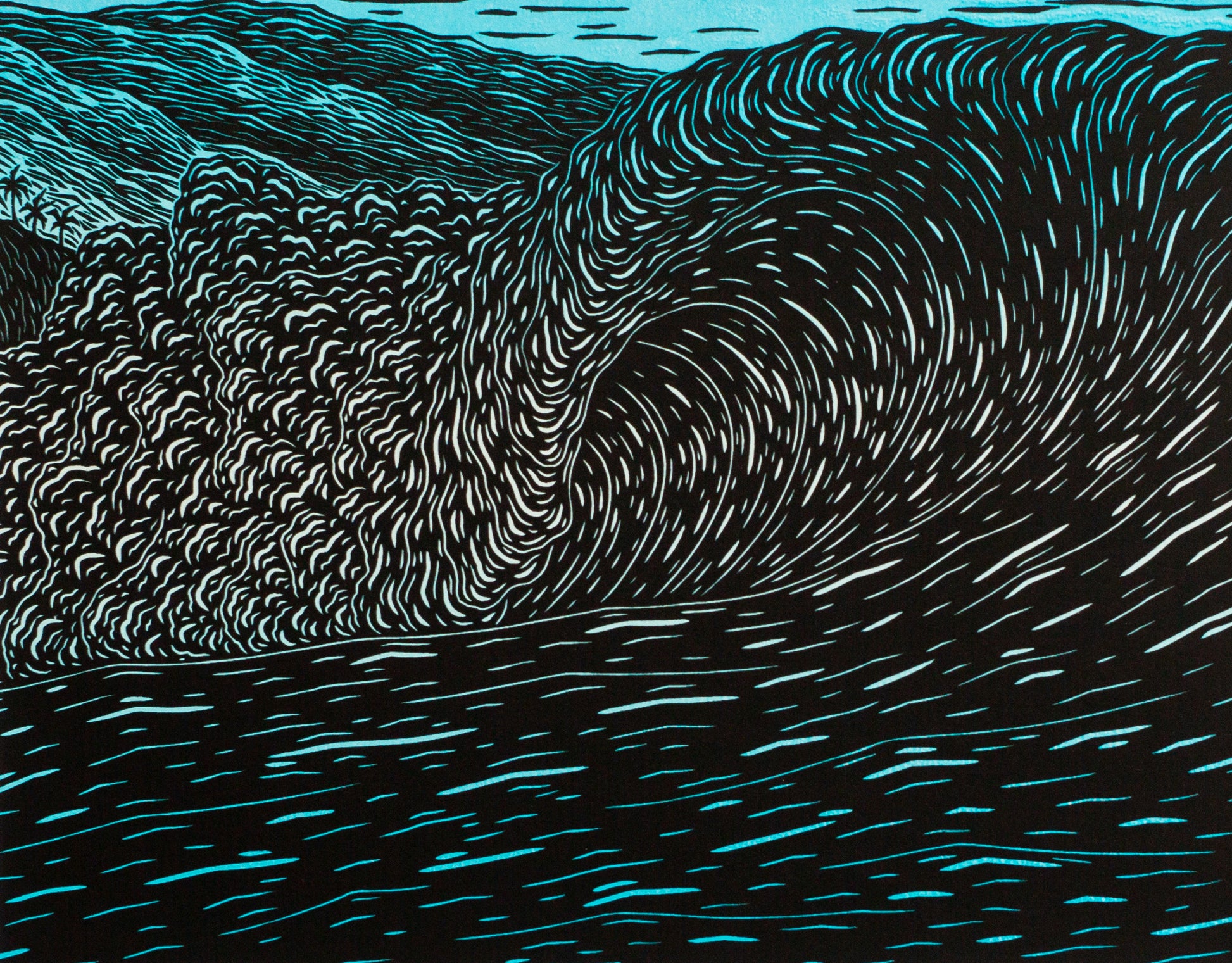 This woodcut print was inspired by the crown jewel on the North Shore of Oahu, the Banzai Pipeline. Mt. Ka’ala, the highest mountain on the island, is shown in the background. For Kean, time between waves is usually spent getting lost in this incredible view.