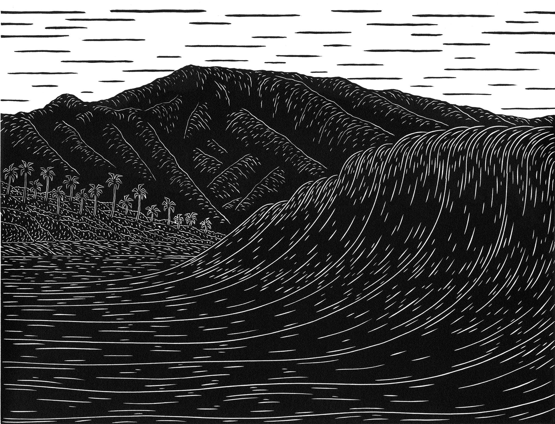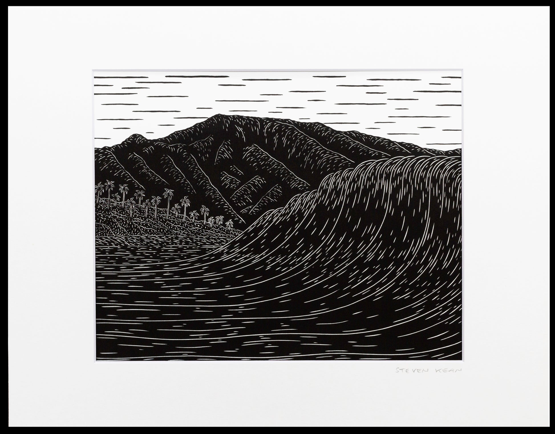 pre·mo·ni·tion - a strong feeling that something is about to happen. In this piece, Kean illustrates an unbroken wave as seen from a surf location on the North Shore of Oahu. Mt. Ka'ala, the tallest mountain on Oahu is seen in the background while the wave in the foreground is about to unleash its power onto the reef below.