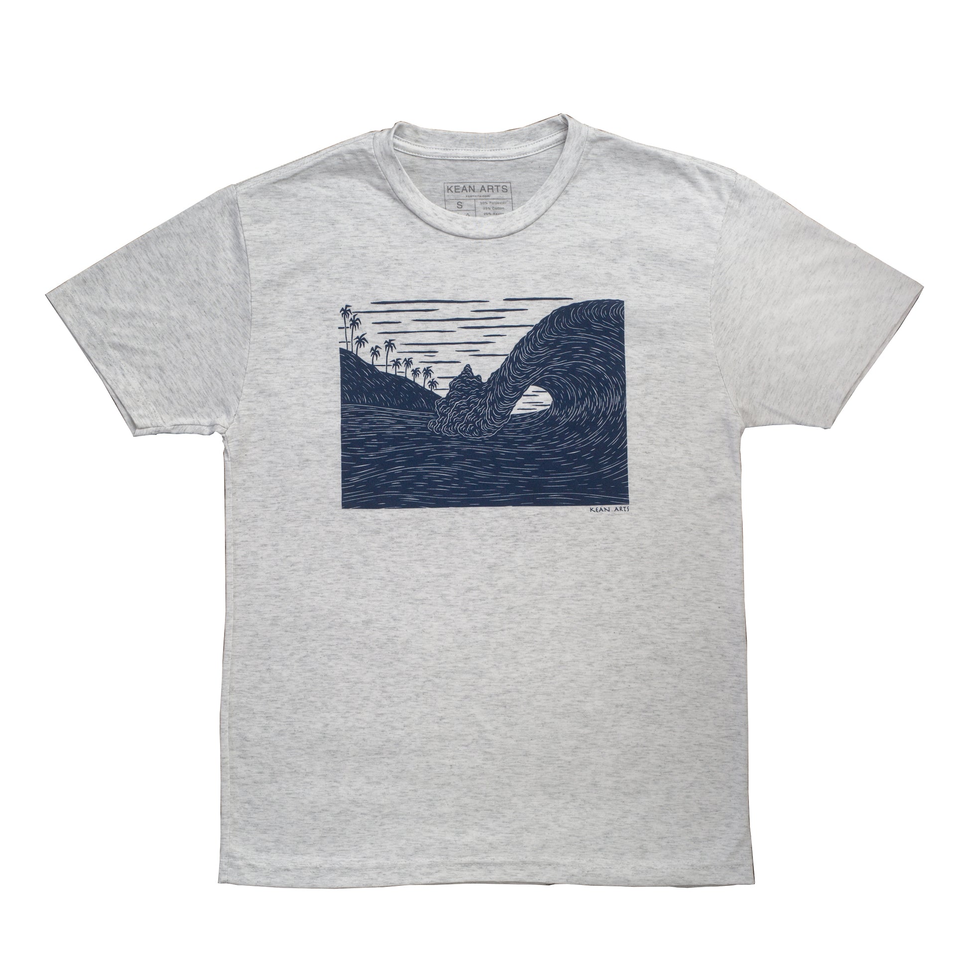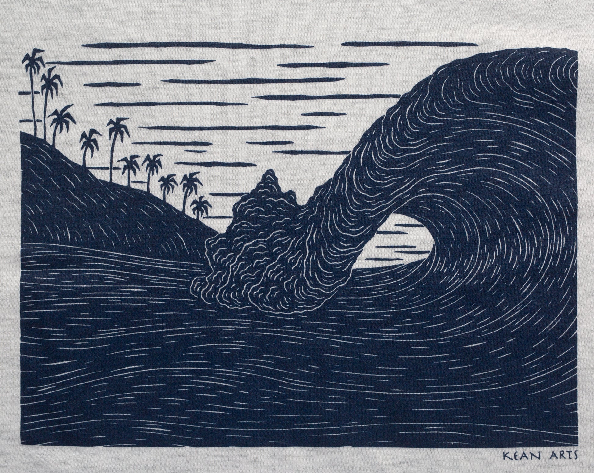 It is a common sight in the Hawaiian Islands to see mountains lined with palm trees while perfect surf breaks below at sea. In this print, Kean combines mauka and makai. His signature palms line the mountain in the background and a moment of impact is captured from a breaking wave.
