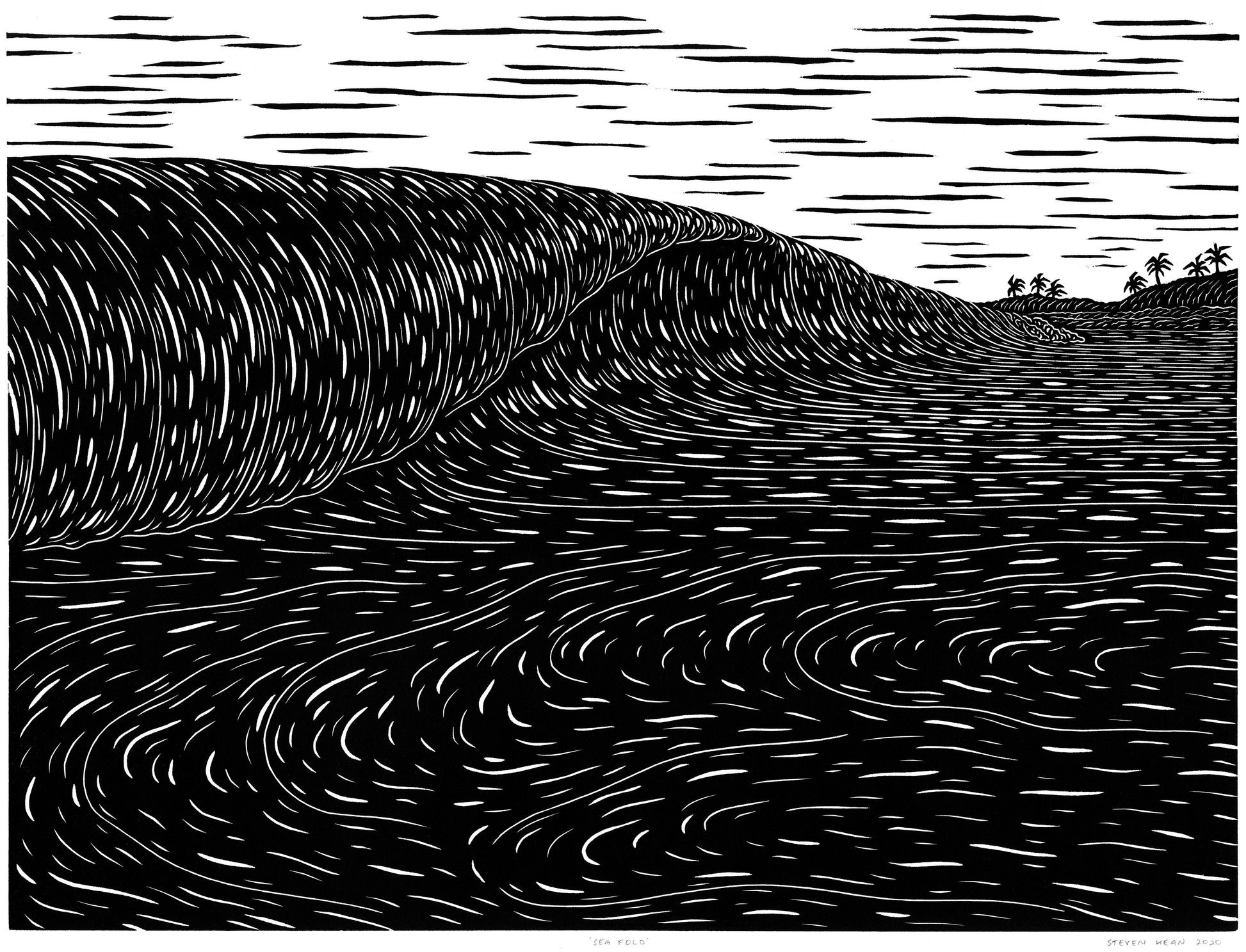 In this woodcut print, a unique perspective of a breaking wave is presented. The eddies in the foreground and natural movement of the wave are achieved with a steady hand and carefully carved lines.