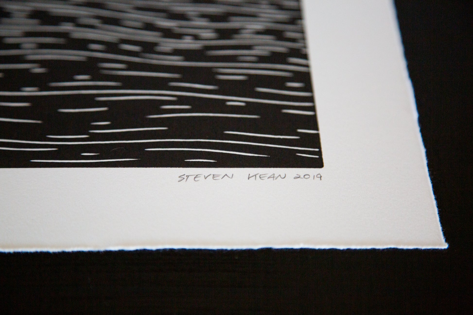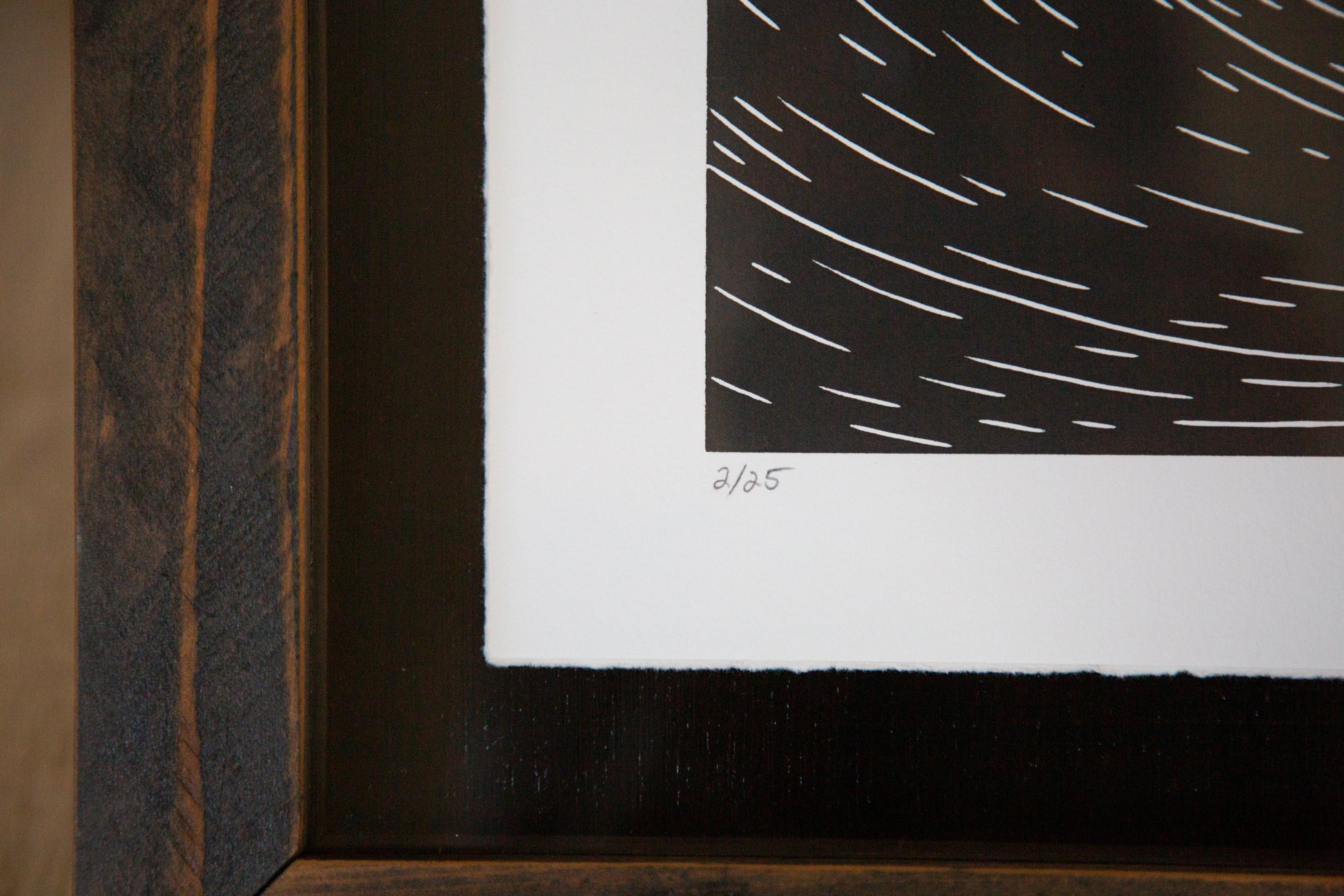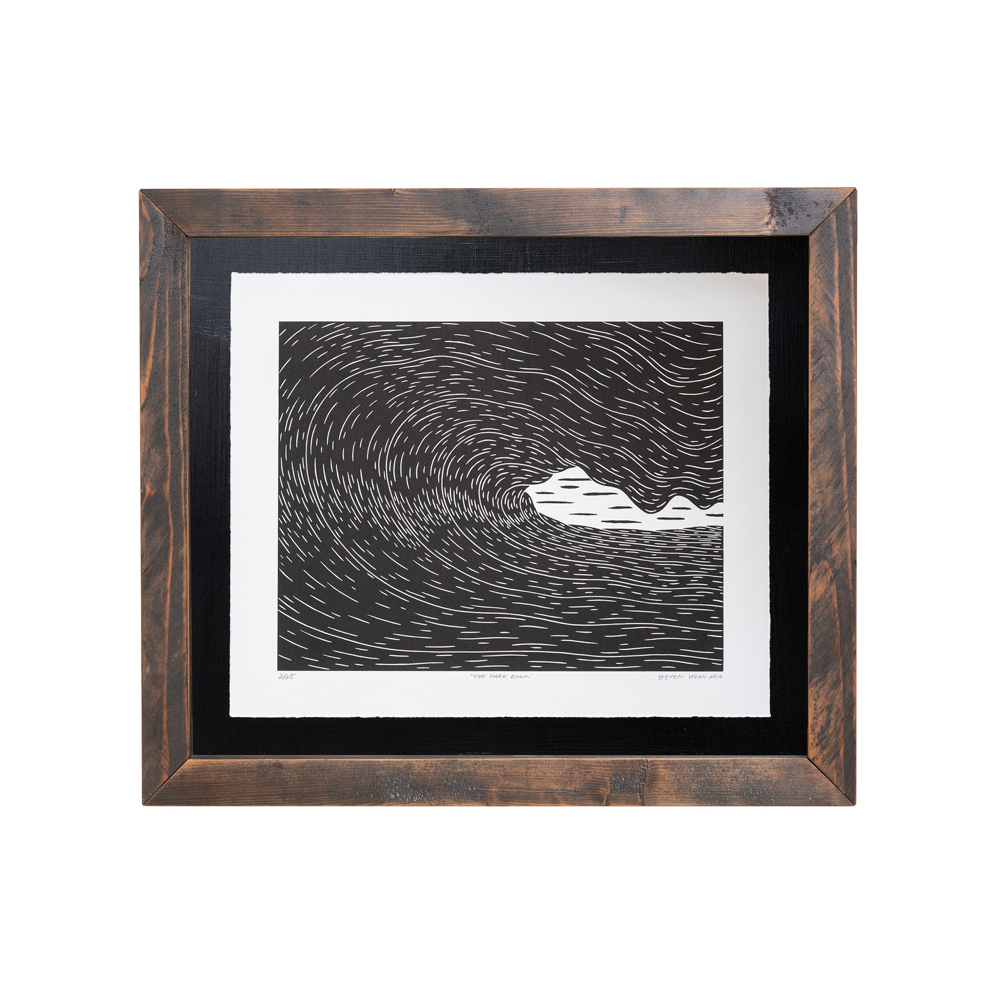 This original woodcut print depicts a vantage point from the depths of a barreling wave. As a surfer, it's one of the most coveted aspects of the surfing experience.