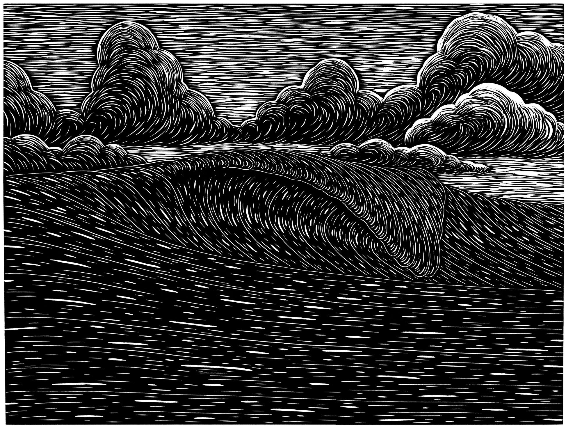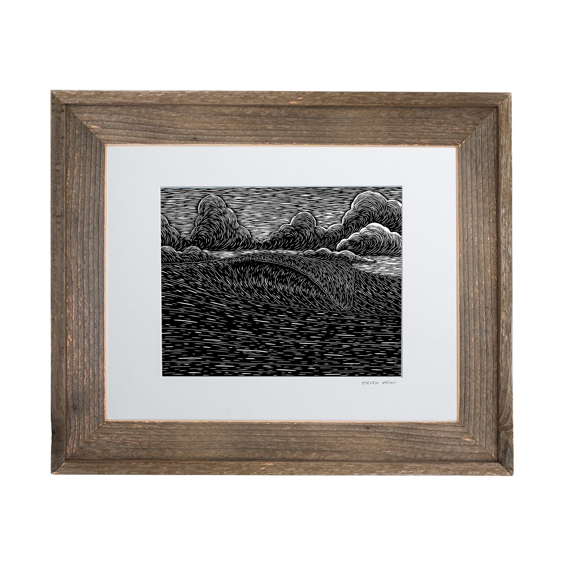 In this woodcut print, Kean complements a perfectly breaking wave with billowing cumulonimbus clouds. There is a sense of movement throughout the piece. This is achieved by carefuly carving smooth and flowing lines into the wood. A sharp gouge and a steady hand lead the way.